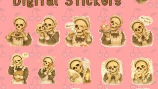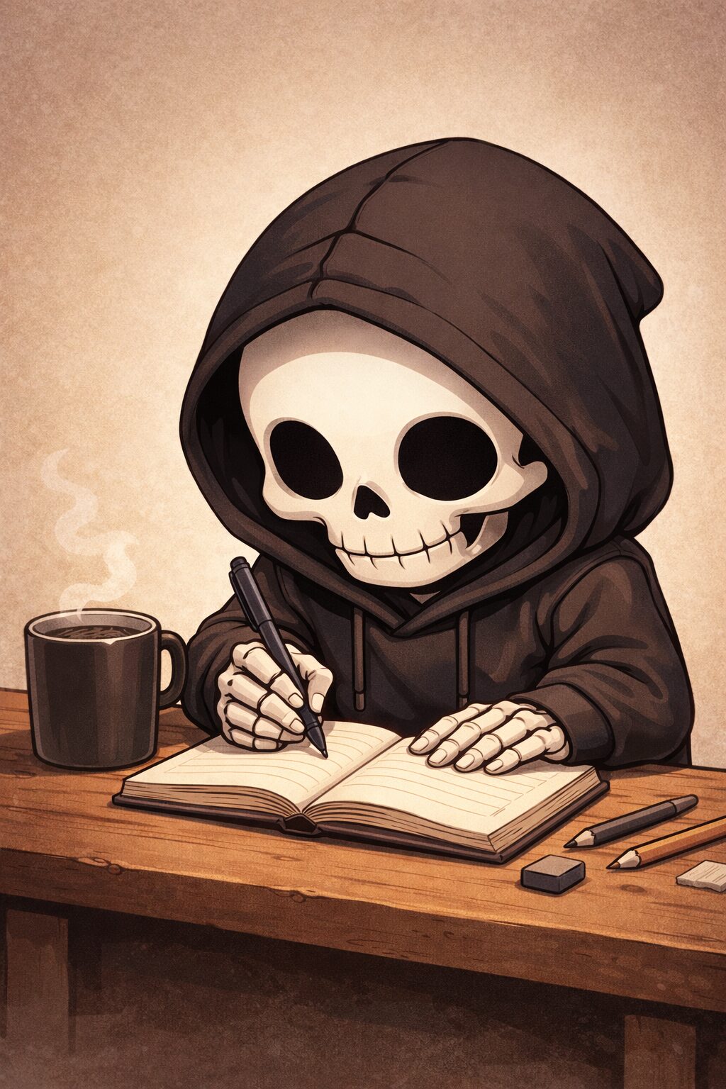 コーヒー隣に何か書いてる骸骨パーカー男