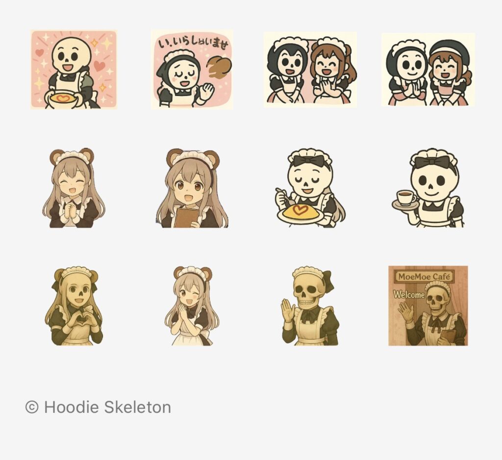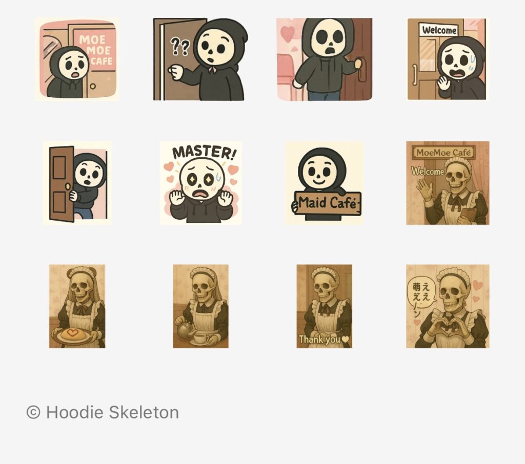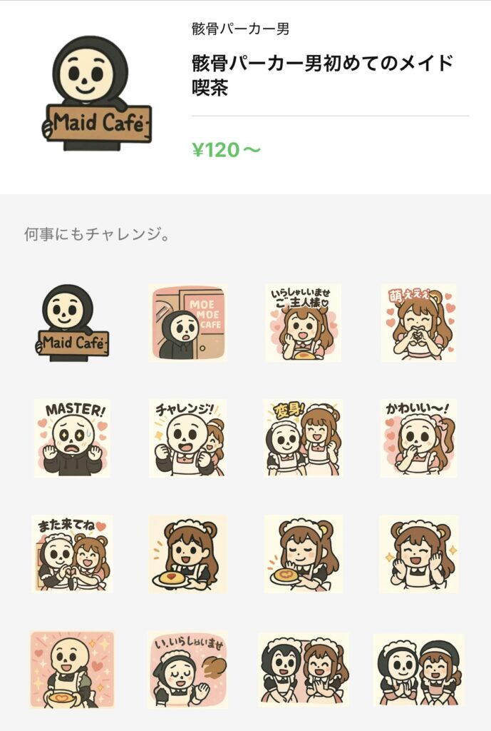 骸骨パーカー男初めてのメイド喫茶のLINEスタンプ販売しています。