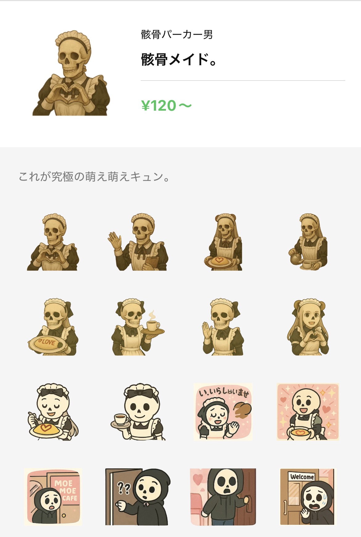 骸骨パーカー男初めてのメイド喫茶のLINEスタンプ販売しています。