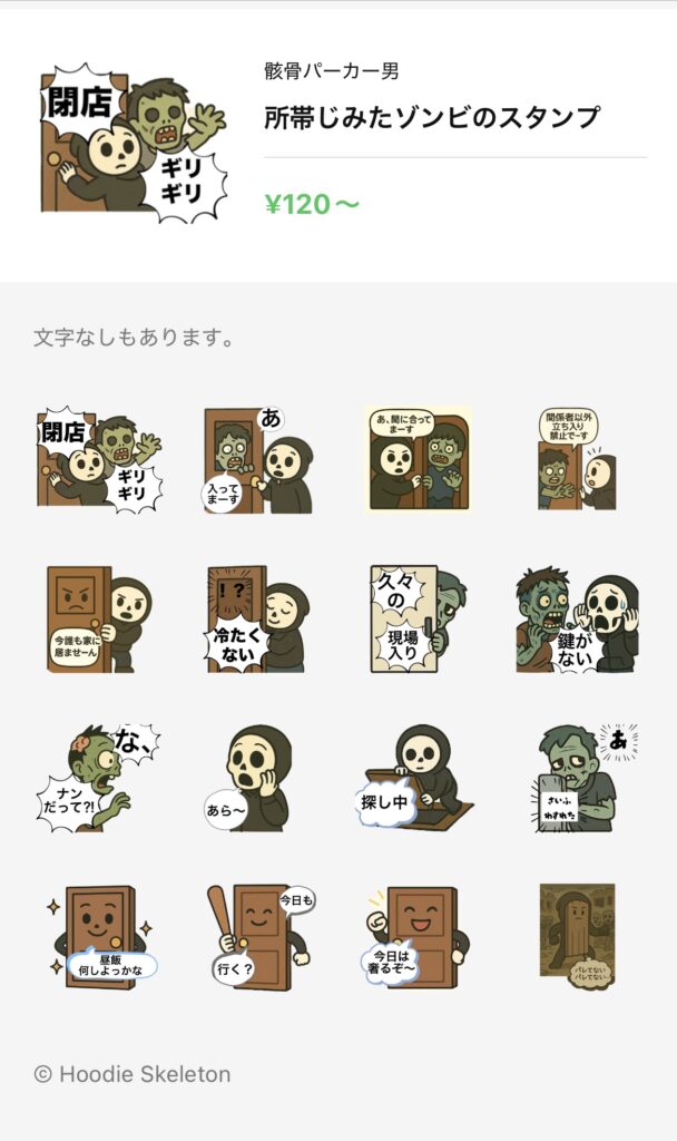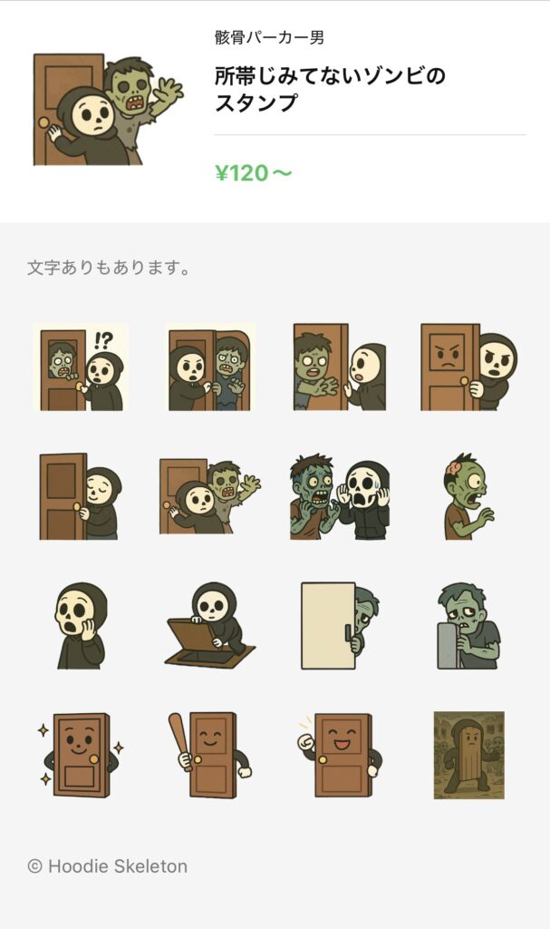 どうも、骸骨パーカー男です。ゾンビのLINEスタンプ承認下りたので、販売しています。これは所帯じみてる方と所帯じみてないゾンビの2パターン用意しています。